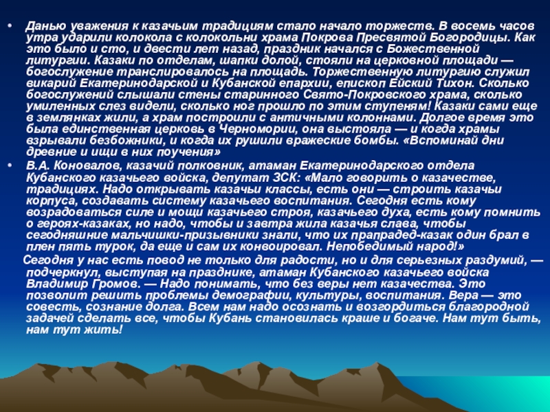 Сегодня у нас есть повод не только для радости, но и для серьезных раздумий, — подчеркнул, выступая на празднике, атаман Кубанского казачьего войска Владимир Громов. — Надо понимать, что без веры нет казачества. Это позволит решить проблемы демографии, культуры, воспитания. Вера — это совесть, сознание долга. Всем нам надо осознать и возгордиться благородной задачей сделать все, чтобы Кубань становилась краше и богаче. Нам тут быть, нам тут жить!
