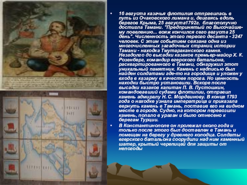 двигаясь вдоль берегов Крыма, 25 августа1792г. благополучно достигла Тамани. "Предпринятый по Высочайше-му повелению... вояж кончился сего августа 25 день". Численность этого первого десанта - 3247 человек. С этим событием связана одна из многочисленных загадочных страниц истории Тамани - находка Тмутараканского камня. Незадолго до высадки казаков премьер-майор X. К. Розенберг, командир егерского батальона, расквартированного в Тамани, обнаружил этот уникальный памятник. Камень с надписью был найден солдатами где-то на городище и уложен у входа в казарму в качестве порога. Но ценность находки быстро установили. Вскоре после высадки казаков капитан П. В. Пустошкин, командовавший судами флотилии, отправил камень адмиралу Н. С. Мордвинову. В конце 1793 года о находке узнала императрица и приказала вернуть камень в Тамань, поставив его на видном месте в городе. Судно, на котором перевозили камень, попало в ураган и было отнесено к берегам Турции.