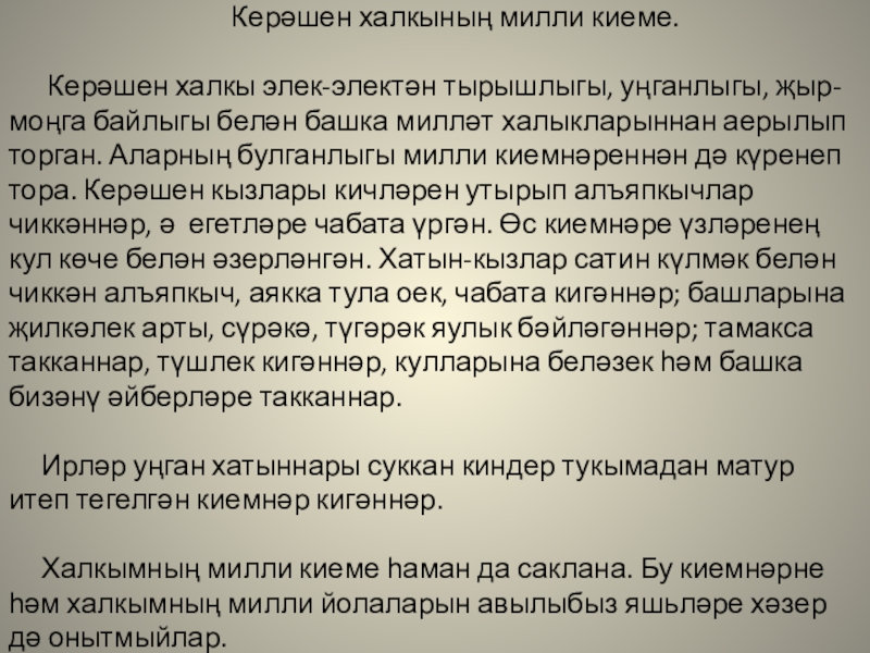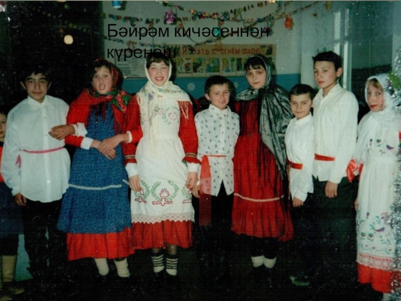 Слайд 17 Төрле бәйрәмнәрдә яшьләребез керәшен халкының милли киемнәрен кияләр. Алар бик