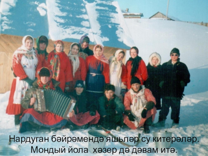 Слайд 12Нардуган бәйрәмендә яшьләр су китерәләр. Мондый йола хәзер дә дәвам итә.