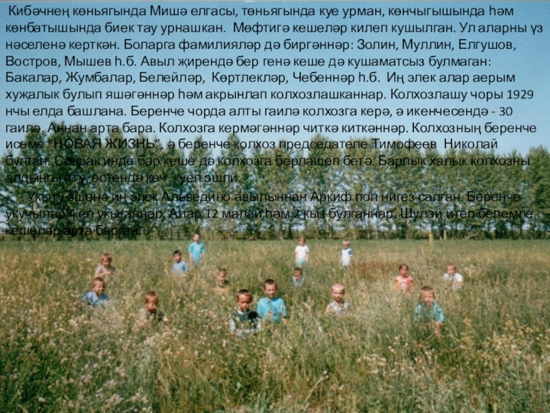 биек тау урнашкан. Мөфтигә кешеләр килеп кушылган. Ул аларны үз нәселенә керткән. Боларга фамилияләр дә биргәннәр: Золин, Муллин, Елгушов, Востров, Мышев һ.б. Авыл җирендә бер генә кеше дә кушаматсыз булмаган: Бакалар, Жумбалар, Белейләр, Көртлекләр, Чебеннәр һ.б. Иң элек алар аерым хуҗалык булып яшәгәннәр һәм акрынлап колхозлашканнар. Колхозлашу чоры 1929 нчы елда башлана. Беренче чорда алты гаилә колхозга керә, ә икенчесендә - 30 гаилә. Аннан арта бара. Колхозга кермәгәннәр читкә киткәннәр. Колхозның беренче исеме “НОВАЯ ЖИЗНЬ”, ә беренче колхоз председателе Тимофеев Николай булган. Соңрак инде бар кеше дә колхозга берләшеп бетә. Барлык халык колхозны алдынгы итү өстендә көч куеп эшли.