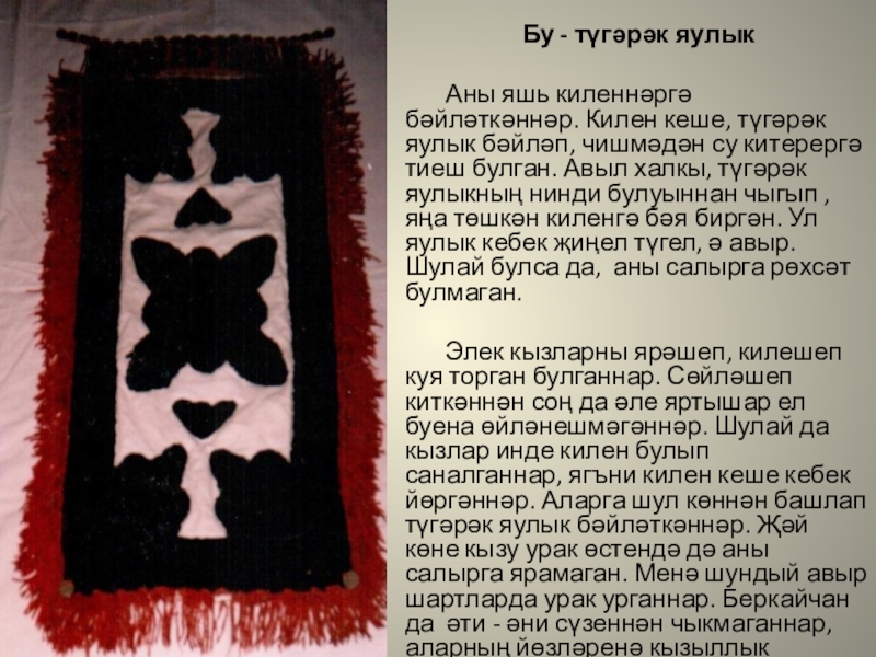 Аны яшь киленнәргә бәйләткәннәр. Килен кеше, түгәрәк яулык бәйләп, чишмәдән су китерергә тиеш булган. Авыл халкы, түгәрәк яулыкның нинди булуыннан чыгып , яңа төшкән киленгә бәя биргән. Ул яулык кебек җиңел түгел, ә авыр. Шулай булса да, аны салырга рөхсәт булмаган.