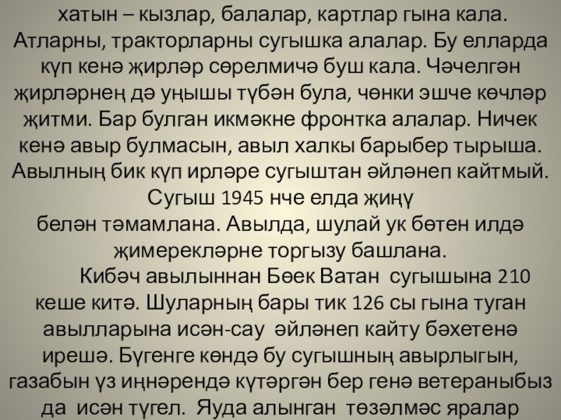 кызлар, балалар, картлар гына кала. Атларны, тракторларны сугышка алалар. Бу елларда күп кенә җирләр сөрелмичә буш кала. Чәчелгән җирләрнең дә уңышы түбән була, чөнки эшче көчләр җитми. Бар булган икмәкне фронтка алалар. Ничек кенә авыр булмасын, авыл халкы барыбер тырыша. Авылның бик күп ирләре сугыштан әйләнеп кайтмый. Сугыш 1945 нче елда җиңү