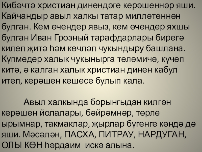 Слайд 11Кибәчтә христиан динендәге керәшеннәр яши. Кайчандыр авыл халкы татар милләтеннән булган.