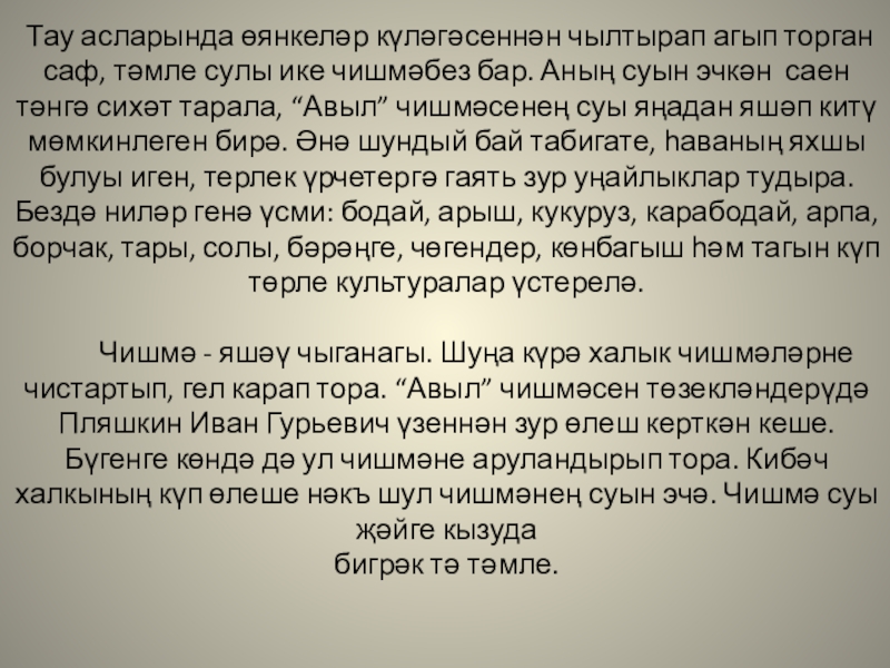 Слайд 6 Тау асларында өянкеләр күләгәсеннән чылтырап агып торган саф, тәмле сулы