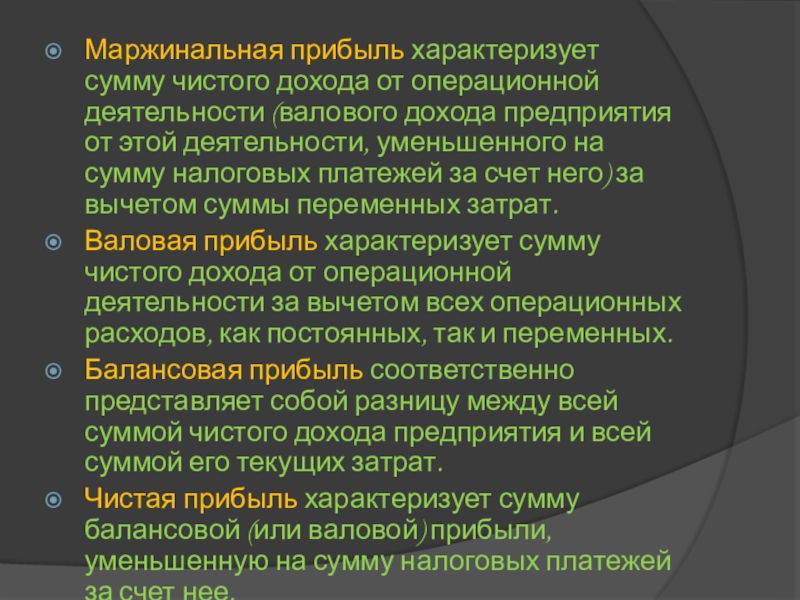 Слайд 10Маржинальная прибыль характеризует сумму чистого дохода от операционной деятельности (валового дохода