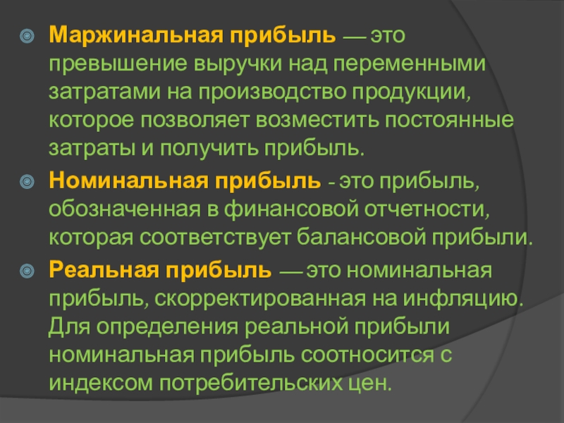 Слайд 5Маржинальная прибыль — это превышение выручки над переменными затратами на производство продукции,
