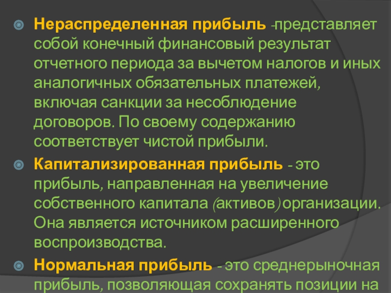 Слайд 6Нераспределенная прибыль -представляет собой конечный финансовый результат отчетного периода за вычетом налогов