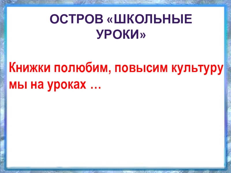 Остров «ШКОЛЬНЫЕ УРОКИ»Книжки полюбим, повысим культуру мы на уроках …