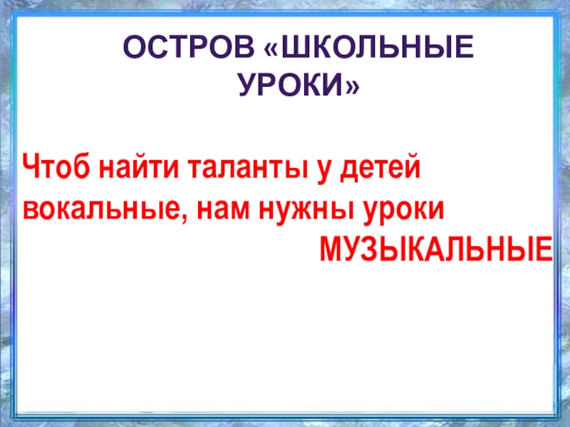 Остров «ШКОЛЬНЫЕ УРОКИ»Чтоб найти таланты у детей вокальные, нам нужны урокиМУЗЫКАЛЬНЫЕ