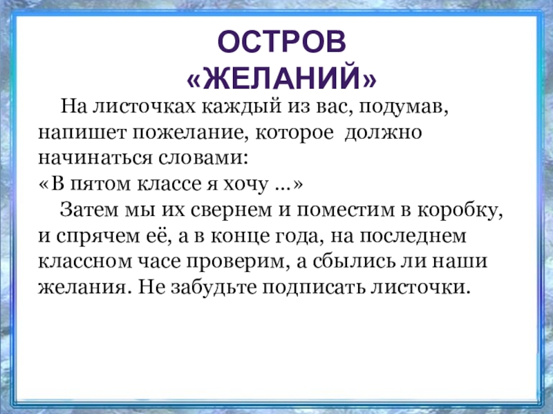 Остров «Желаний»На листочках каждый из вас, подумав, напишет пожелание, которое должно начинаться словами: «В пятом классе я