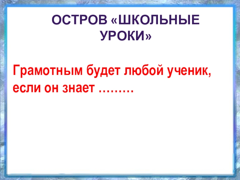 Остров «ШКОЛЬНЫЕ УРОКИ»Грамотным будет любой ученик, если он знает ………