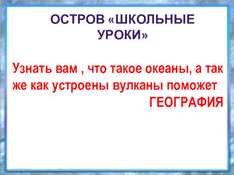 Остров «ШКОЛЬНЫЕ УРОКИ»Узнать вам , что такое океаны, а так же как устроены вулканы поможет ГЕОГРАФИЯ