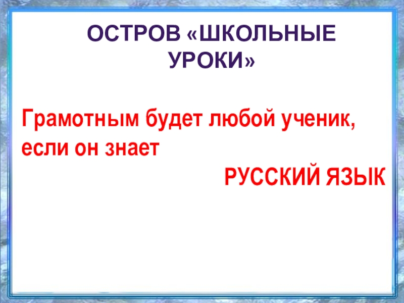Остров «ШКОЛЬНЫЕ УРОКИ»Грамотным будет любой ученик, если он знаетРУССКИЙ ЯЗЫК