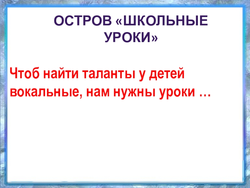 Остров «ШКОЛЬНЫЕ УРОКИ»Чтоб найти таланты у детей вокальные, нам нужны уроки …
