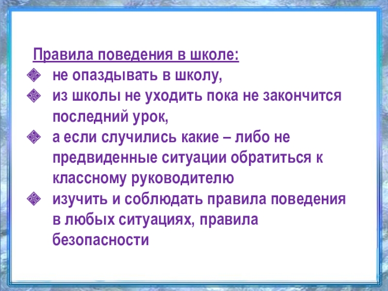 Правила поведения в школе:не опаздывать в школу,из школы не уходить пока не закончится последний урок,а если