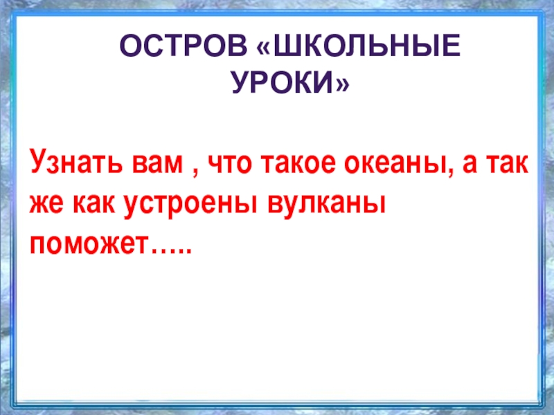 Остров «ШКОЛЬНЫЕ УРОКИ»Узнать вам , что такое океаны, а так же как устроены вулканы поможет…..