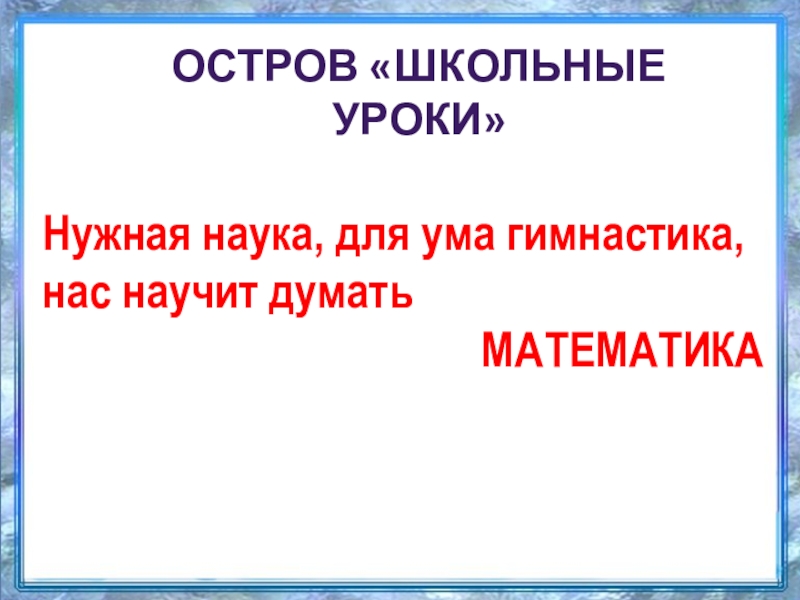 Остров «ШКОЛЬНЫЕ УРОКИ»Нужная наука, для ума гимнастика, нас научит думать МАТЕМАТИКА