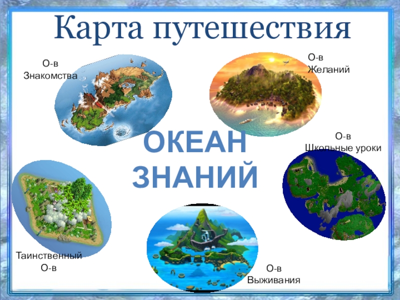 Карта путешествияОкеан знанийО-в ЗнакомстваО-в Школьные урокиО-в ВыживанияО-в ЖеланийТаинственный О-в