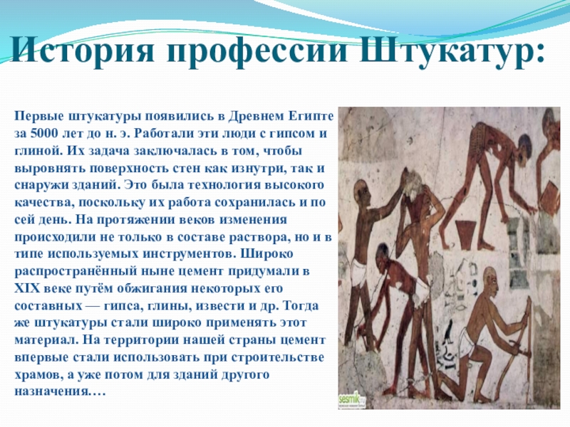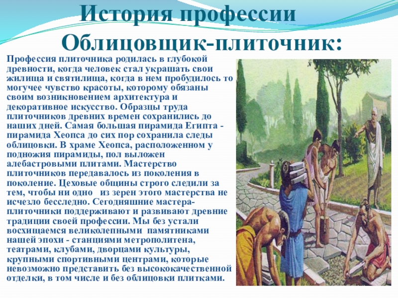 Профессия плиточника родилась в глубокой древности, когда человек стал украшать свои жилища и святилища, когда в нем пробудилось то могучее чувство красоты, которому обязаны своим возникновением архитектура и декоративное искусство. Образцы труда плиточников древних времен сохранились до наших дней. Самая большая пирамида Египта - пирамида Хеопса до сих пор сохранила следы облицовки. В храме Хеопса, расположенном у подножия пирамиды, пол выложен алебастровыми плитами. Мастерство плиточников передавалось из поколения в поколение. Цеховые общины строго следили за тем, чтобы ни одно из зерен этого мастерства не исчезло бесследно. Сегодняшние мастера-плиточники поддерживают и развивают древние традиции своей профессии. Мы без устали восхищаемся великолепными памятниками нашей эпохи - станциями метрополитена, театрами, клубами, дворцами культуры, крупными спортивными центрами, которые невозможно представить без высококачественной отделки, в том числе и без облицовки плитками.