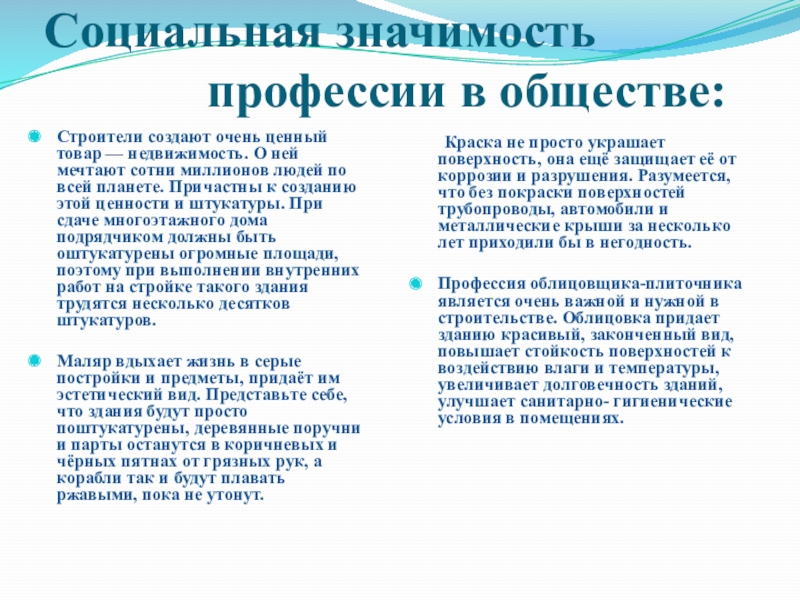 Строители создают очень ценный товар — недвижимость. О ней мечтают сотни миллионов людей по всей планете. Причастны к созданию этой ценности и штукатуры. При сдаче многоэтажного дома подрядчиком должны быть оштукатурены огромные площади, поэтому при выполнении внутренних работ на стройке такого здания трудятся несколько десятков штукатуров.