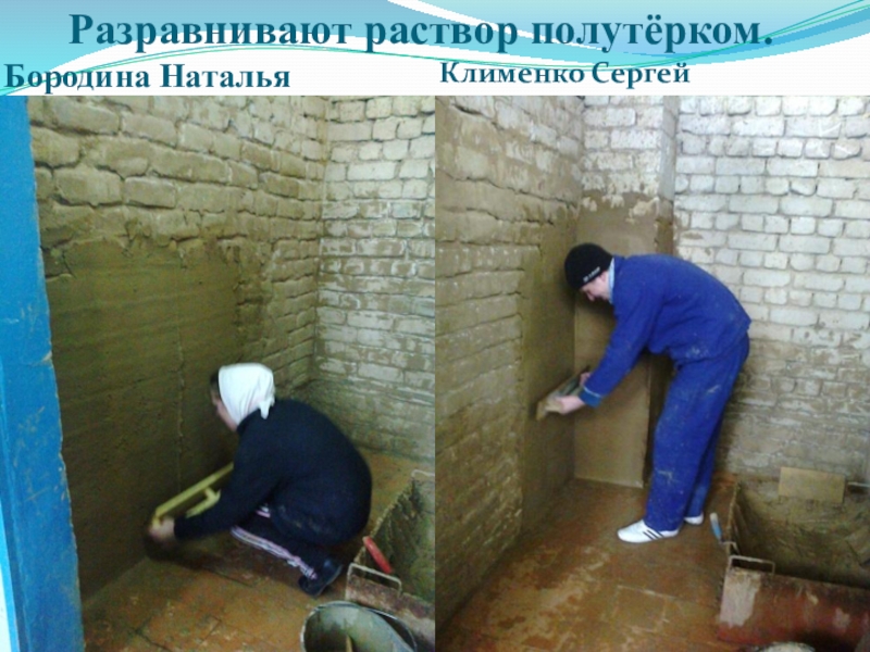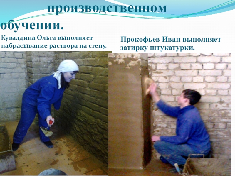 Кувалдина Ольга выполняет набрасывание раствора на стену.