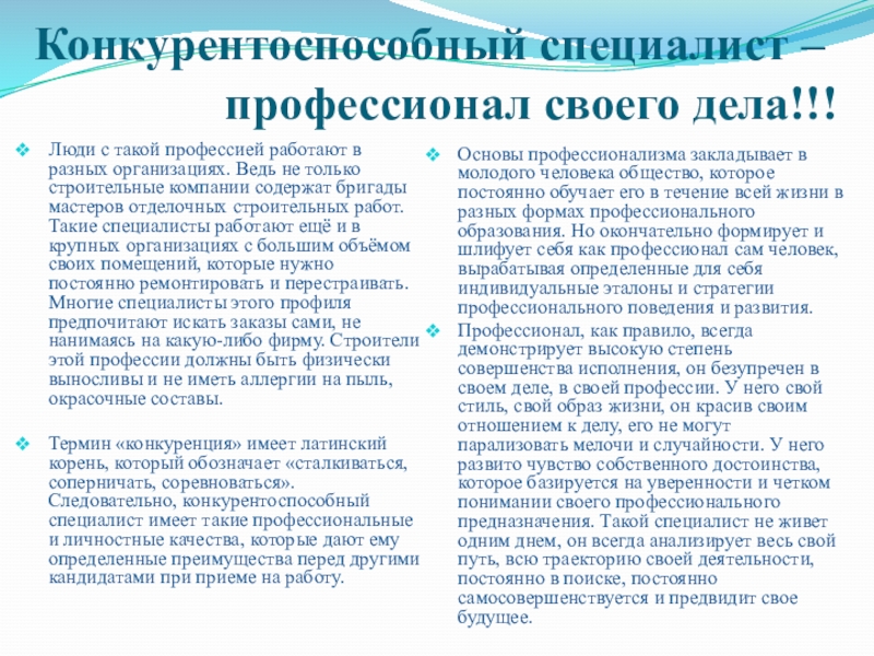 Термин «конкуренция» имеет латинский корень, который обозначает «сталкиваться, соперничать, соревноваться». Следовательно, конкурентоспособный специалист имеет такие профессиональные и личностные качества, которые дают ему определенные преимущества перед другими кандидатами при приеме на работу.