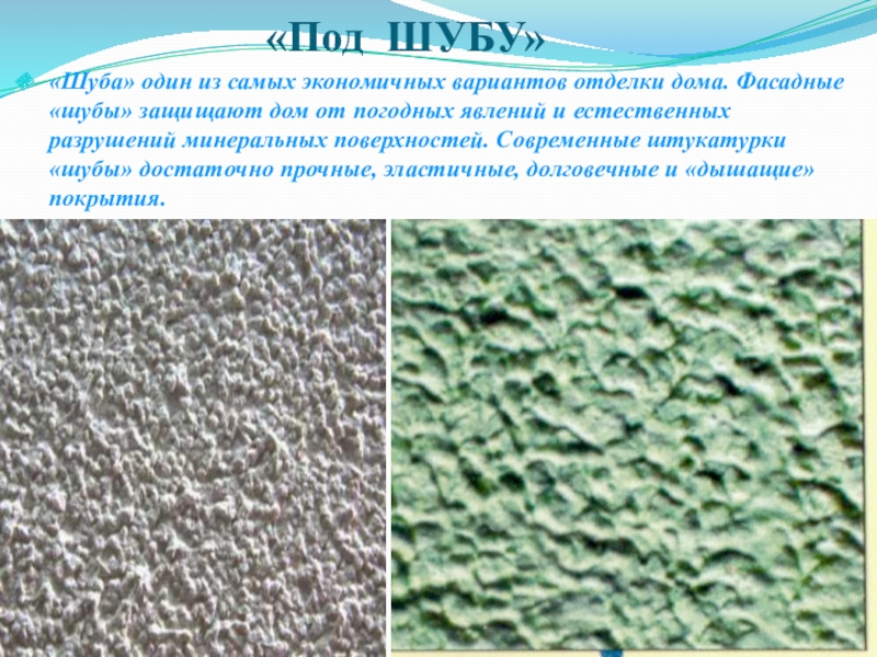 «Шуба» один из самых экономичных вариантов отделки дома. Фасадные «шубы» защищают дом от погодных явлений и естественных разрушений минеральных поверхностей. Современные штукатурки «шубы» достаточно прочные, эластичные, долговечные и «дышащие» покрытия.