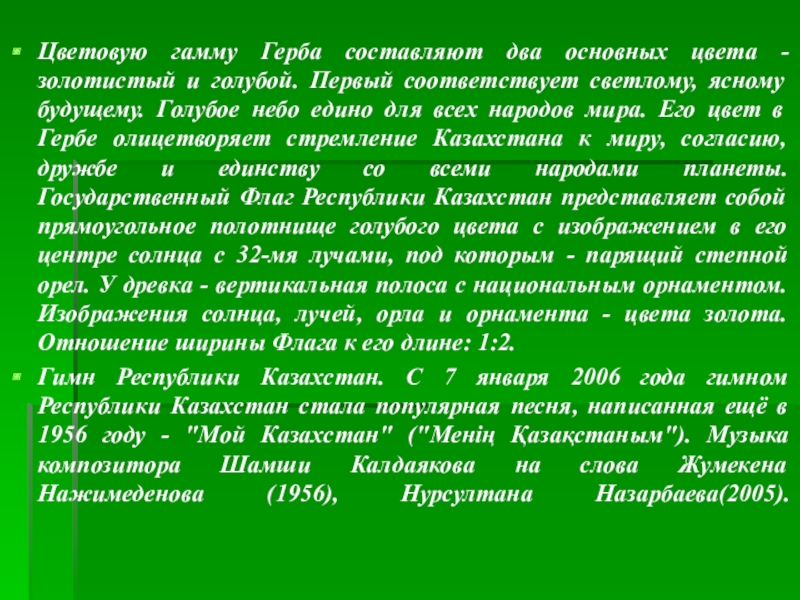 Гимн Республики Казахстан. С 7 января 2006 года гимном Республики Казахстан стала популярная песня, написанная ещё в 1956 году - "Мой Казахстан" ("Менiң Қазақстаным"). Музыка композитора Шамши Калдаякова на слова Жумекена Нажимеденова (1956), Нурсултана Назарбаева(2005).