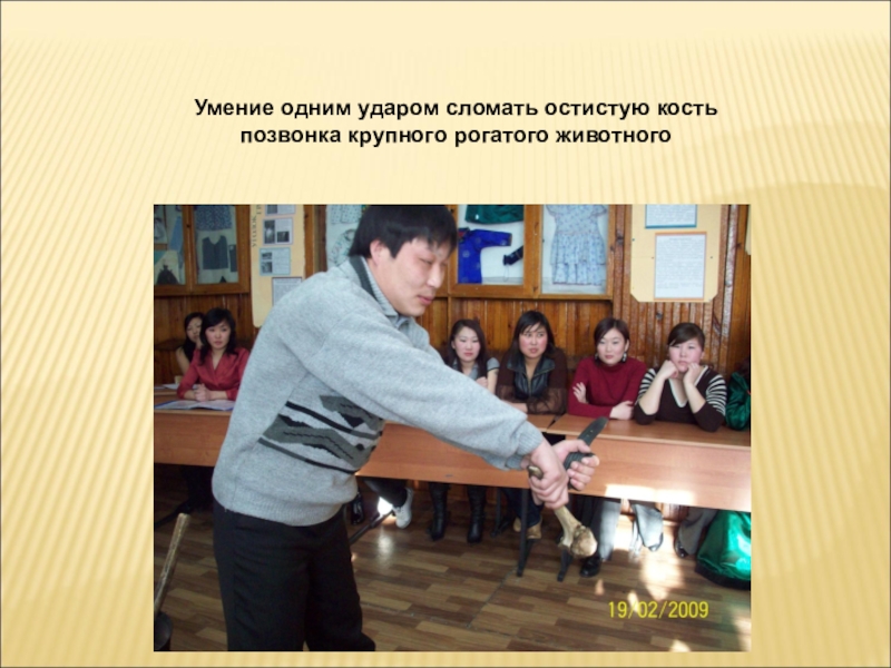 Слайд 32Умение одним ударом сломать остистую кость позвонка крупного рогатого животного
