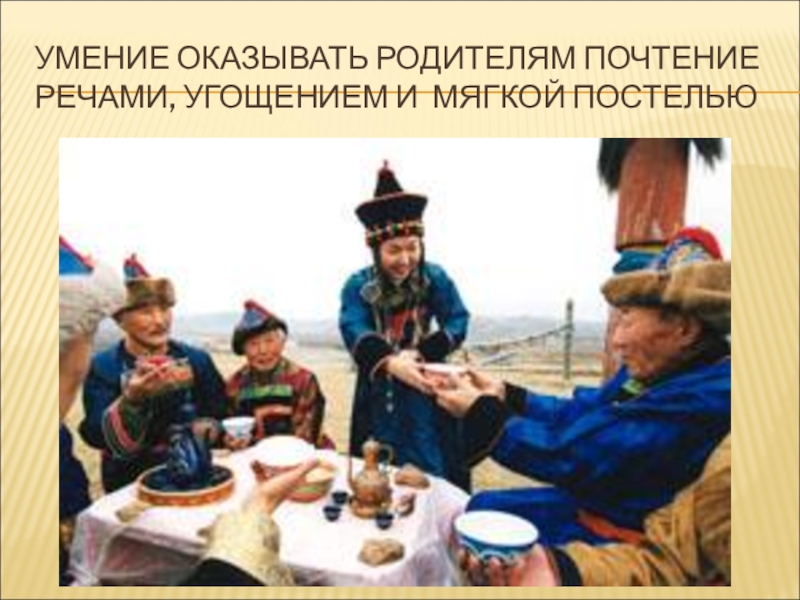 Слайд 33Умение оказывать родителям почтение речами, угощением и мягкой постелью