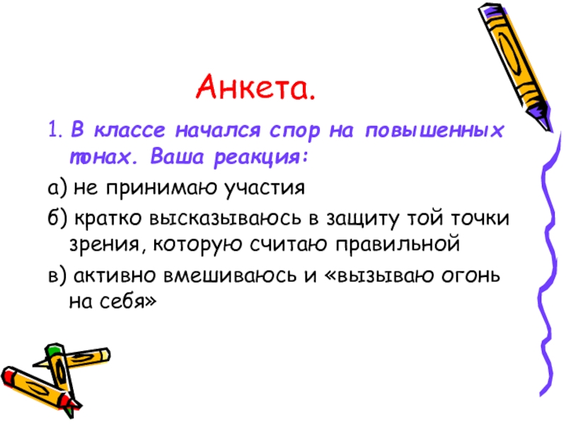 1. В классе начался спор на повышенных тонах. Ваша реакция: