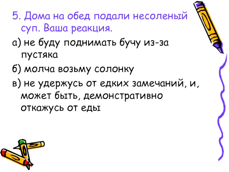 Слайд 75. Дома на обед подали несоленый суп. Ваша реакция.