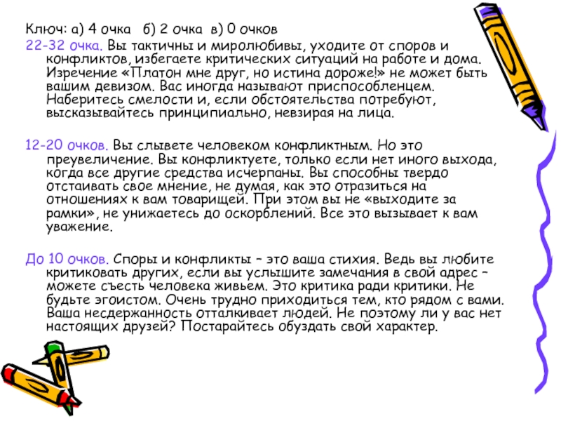 очка. Вы тактичны и миролюбивы, уходите от споров и конфликтов, избегаете критических ситуаций на работе и дома. Изречение «Платон мне друг, но истина дороже!» не может быть вашим девизом. Вас иногда называют приспособленцем. Наберитесь смелости и, если обстоятельства потребуют, высказывайтесь принципиально, невзирая на лица.