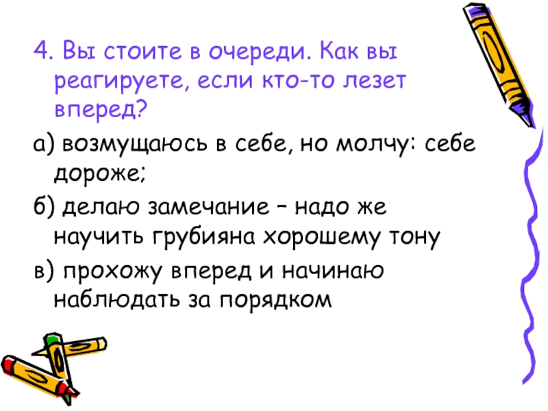 Слайд 64. Вы стоите в очереди. Как вы реагируете, если кто-то лезет