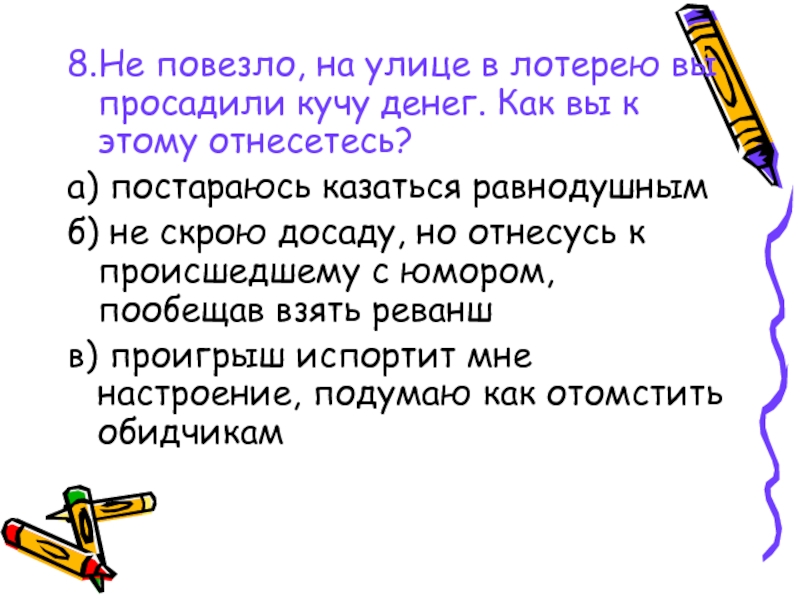 Слайд 108.Не повезло, на улице в лотерею вы просадили кучу денег. Как