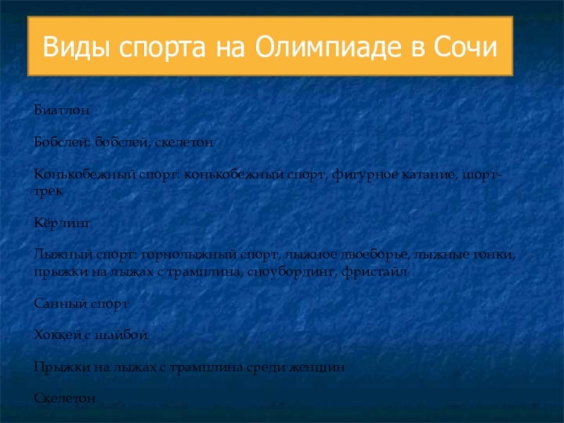 Лыжный спорт: горнолыжный спорт, лыжное двоеборье, лыжные гонки, прыжки на лыжах с трамплина, сноубординг, фристайл