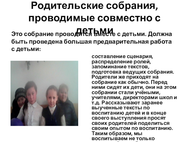 составление сценария, распределение ролей, запоминание текстов, подготовка ведущих собрания. Родители же приходят на собрание как обычно. Перед ними сидят их дети, они на этом собрании стали учёными, учителями, директорами школ и т.д. Рассказывают заранее выученные тексты по воспитанию детей и в конце своего выступления просят своих родителей поделиться своим опытом по воспитанию. Таким образом, мы воспитываем не только родителей, но и будущих родителей – наших детей.