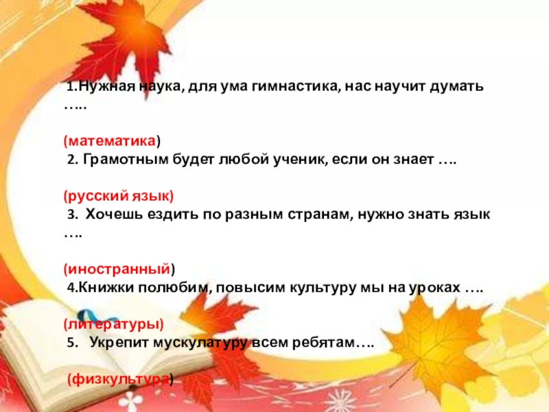 1.Нужная наука, для ума гимнастика, нас научит думать ….. (математика) 2. Грамотным будет любой ученик, если