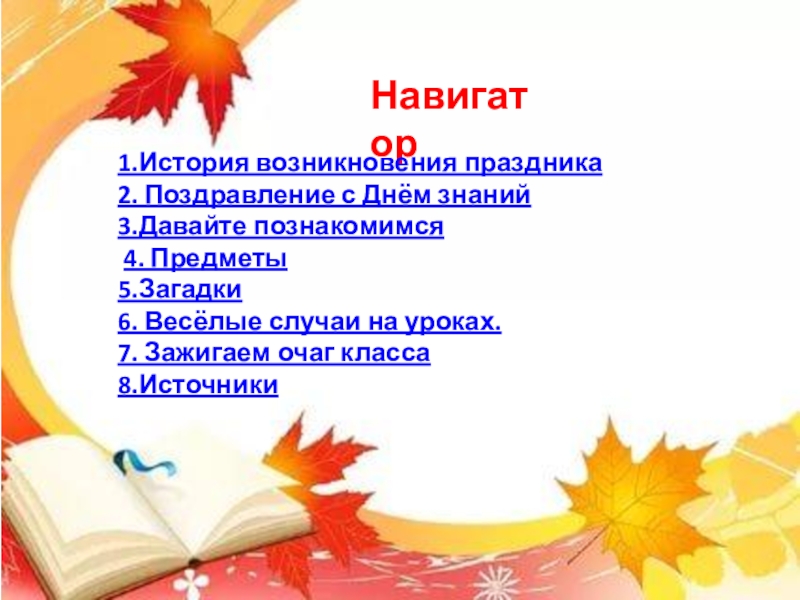 Навигатор1.История возникновения праздника 2. Поздравление с Днём знаний 3.Давайте познакомимся 4. Предметы 5.Загадки 6. Весёлые случаи на уроках.7. Зажигаем очаг класса 8.Источники