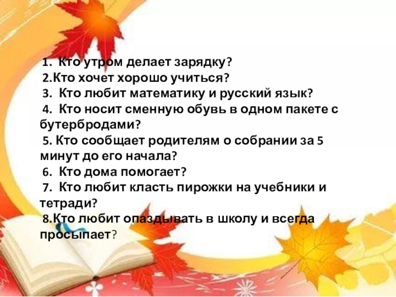1. Кто утром делает зарядку? 2.Кто хочет хорошо учиться? 3. Кто любит математику и русский язык?