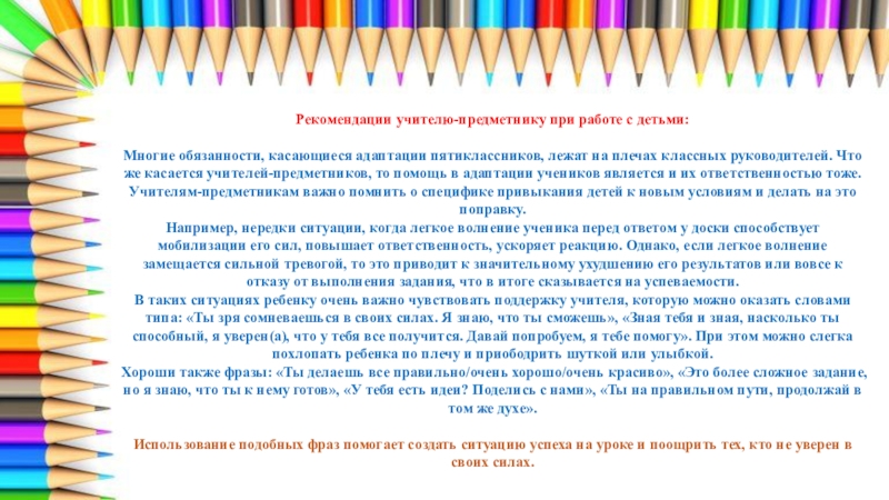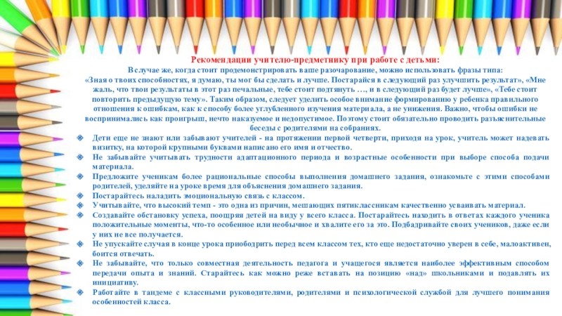 Слайд 23Рекомендации учителю-предметнику при работе с детьми: