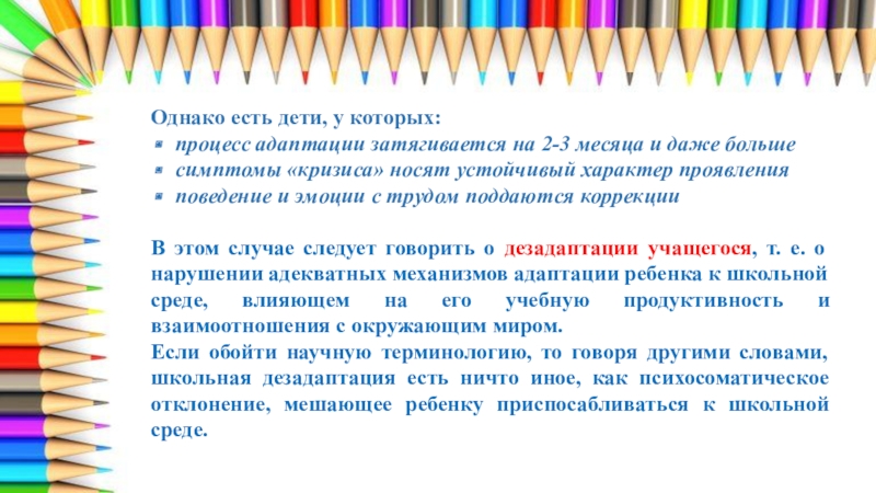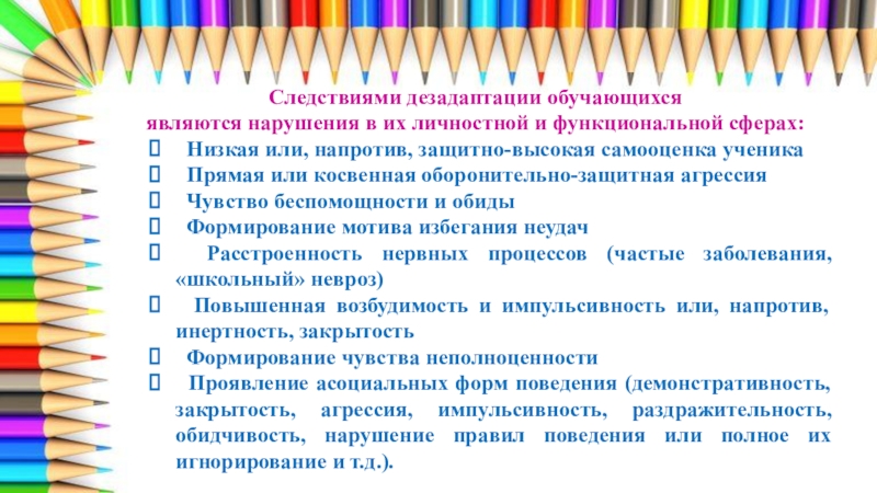 В этом случае следует говорить о дезадаптации учащегося, т. е. о нарушении адекватных механизмов адаптации ребенка к школьной среде, влияющем на его учебную продуктивность и взаимоотношения с окружающим миром.