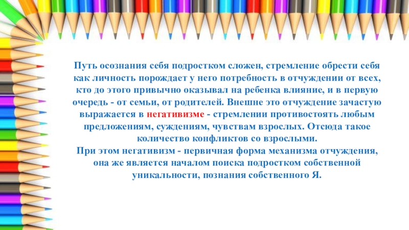 При этом негативизм - первичная форма механизма отчуждения, она же является началом поиска подростком собственной уникальности, познания собственного Я.