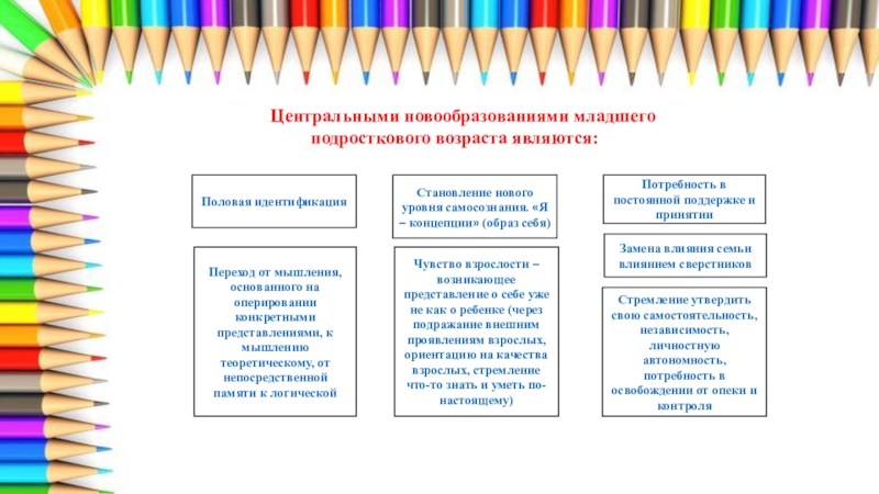 На фоне развития ведущей деятельность происходит развитие центральных новообразований возраста, охватывающее в этом периоде все стороны субъективного развития.