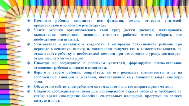 Учитывайте и вникайте в трудности, с которыми сталкивается ребенок при переходе в основную школу, и, постепенно приучая его к самостоятельности, не отказывайте ребенку в необходимой помощи при подготовке к уроку, мотивируя отказ тем, что он уже вырос.