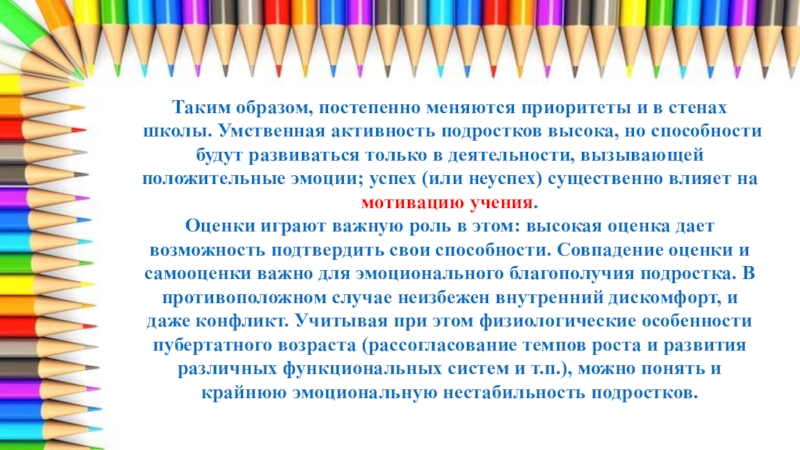 подростков высока, но способности будут развиваться только в деятельности, вызывающей положительные эмоции; успех (или неуспех) существенно влияет на мотивацию учения.
