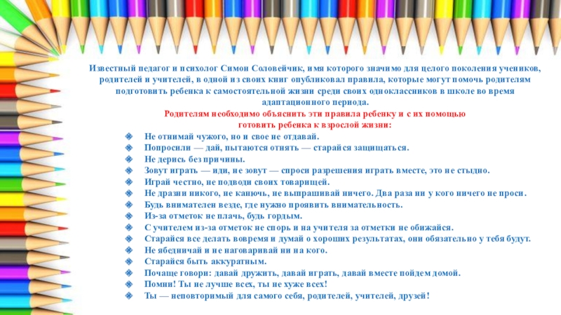 поколения учеников, родителей и учителей, в одной из своих книг опубликовал правила, которые могут помочь родителям подготовить ребенка к самостоятельной жизни среди своих одноклассников в школе во время адаптационного периода.