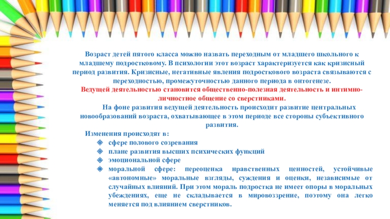 Слайд 3Возраст детей пятого класса можно назвать переходным от младшего школьного к