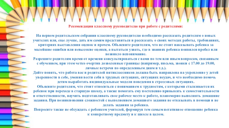 руководителю необходимо рассказать родителям о новых учителях или, еще лучше, дать им самим представиться и рассказать о своих методах работы, требованиях, критериях выставления оценок и прочем. Объясните родителям, что не стоит наказывать ребенка за малейшие ошибки или невысокие оценки, а пытаться узнать, где в знаниях ребенка появился пробел или возникло непонимание.